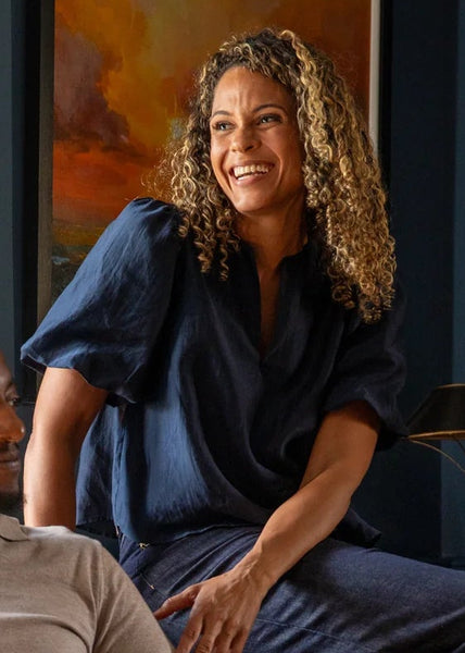 Porcha is a sleek satin party top. Cut in a lightweight material, it features a subtle V-neckline and short puff sleeves. The slightly cropped length makes it ideal for high-waisted trousers or skirts. A single pleat down the back adds movement and detail.