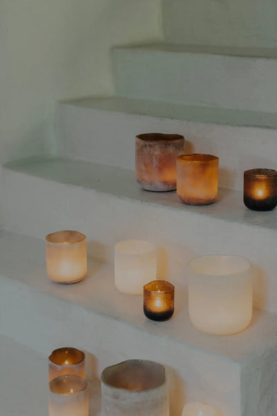 Halde is a handmade votive in frosted glass with an organically shaped edge at the top. Each votive is unique and provides a warm, cozy light.