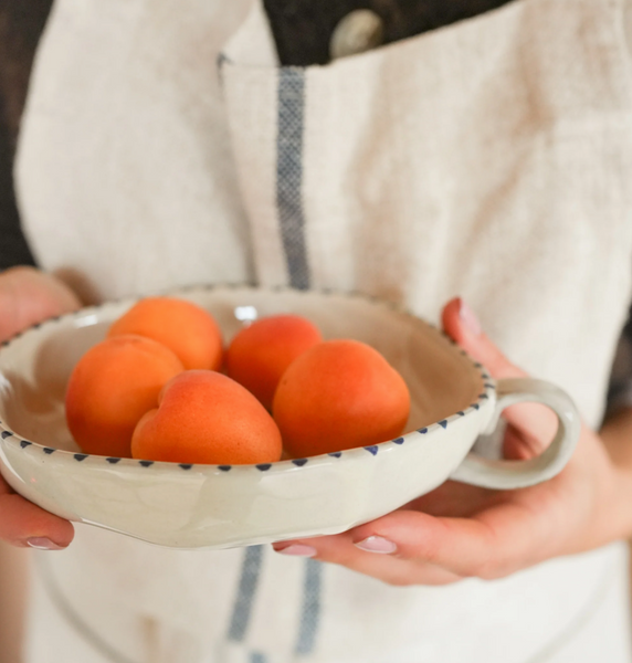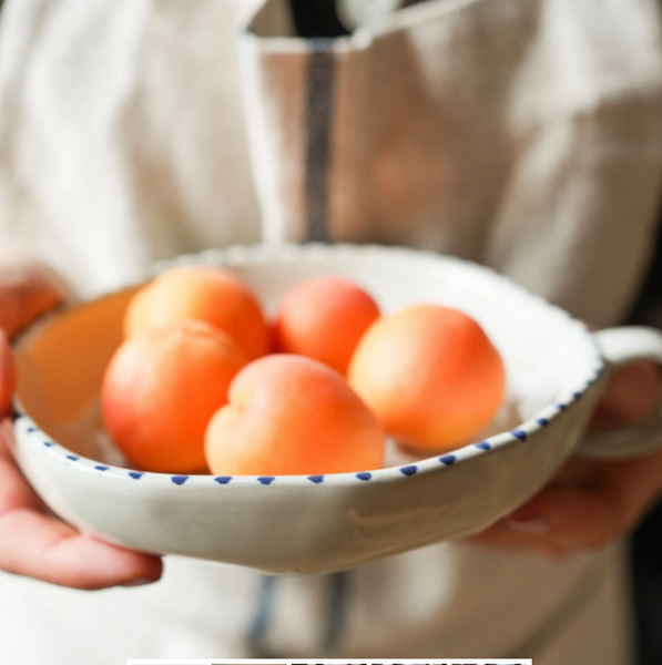 A bowl with a small handle with a sweet little sprig hand painted on the inside and spot details around the top.