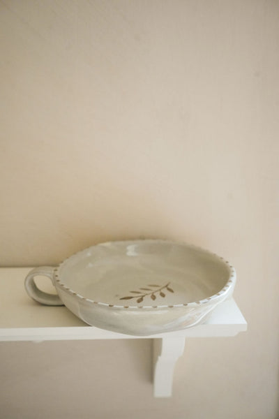 A bowl with a small handle with a sweet little sprig hand painted on the inside and spot details around the top.