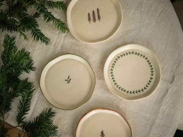 Crafted with a matte cream glaze and hand painted holly sprig, each ceramic plate has a softly unique finish. The gently organic, slightly irregular edge adds to its handmade character, making it ideal for festive gifting, Christmas collections or winter tabletop edits - perfect for mince pies, treats and seasonal bakes.