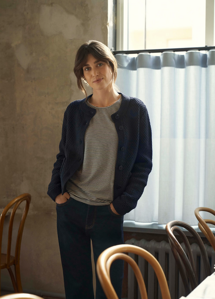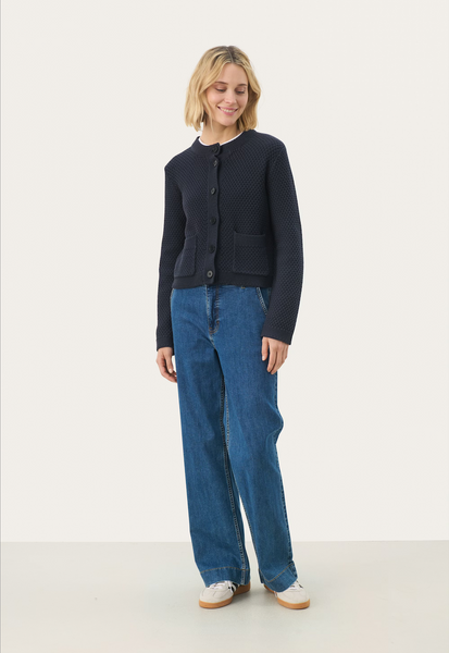 ark navy knitted cardigan features a rich texture and a straight, cropped fit. The large patch pockets and front button fastening add a classic yet modern touch. Wear it over a shirt or dress for a layered look suitable for both everyday and office wear.