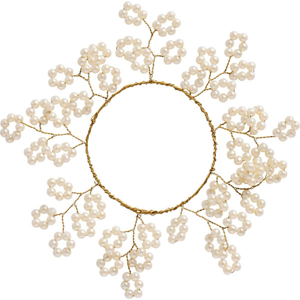 Handmade mini wreath crafted from metal, with white pearly beads. Use it as a hanging ornament, a napkin ring, or as a decorative piece for the table.